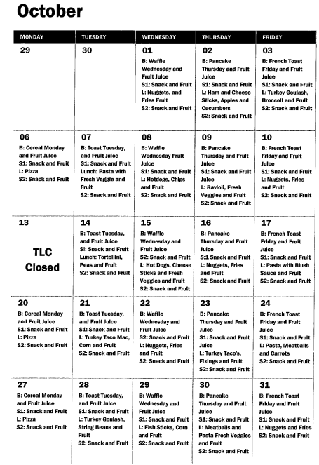 October Lunch Calendar