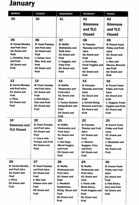 January Lunch Calendar